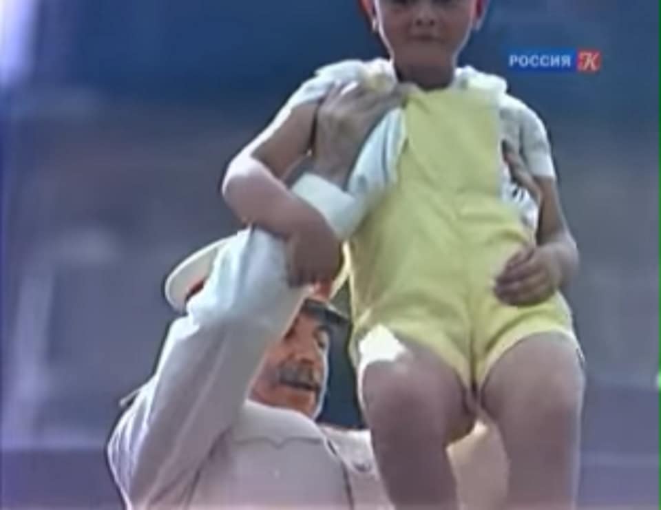 1945年8月12日,莫斯科,運動員遊行大會。史達林左臂曾受重傷,無法如一般人使用,因而免服兵役,此時卻能如此高舉這孩童…